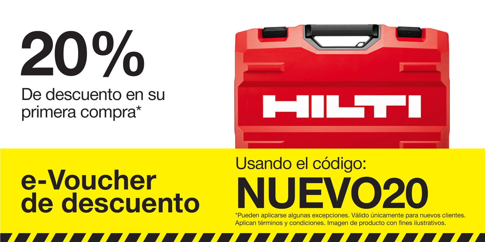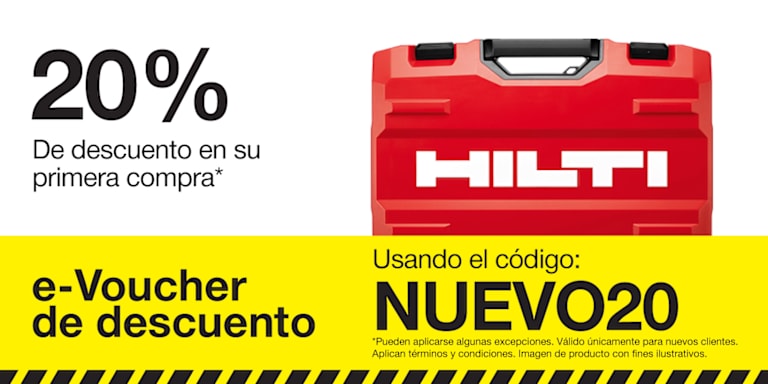 *Esta oferta promocional puede utilizarse solo 1 vez por cuenta de cliente. Sólo es válida para un descuento de 20% en compras elegibles de Hilti. Debe comprarse en Hilti Online y canjearse desde el 01/01/2026 hasta el 31/12/2026 11:59:59 PM. Quedan excluidos los pedidos de reparación, los servicios y el software. Este código sólo se puede canjear en línea. El importe de la compra no incluye gastos de envío. No puede combinarse con ninguna otra oferta. Este código promocional no es transferible. Este código no tiene valor en efectivo y no puede canjearse por dinero ni aplicarse a un saldo pendiente en su cuenta. Oferta nula donde esté prohibida o restringida por ley, reglamento o normas del cliente y sólo disponible hasta agotar existencias. Quedan excluidas todas las cuentas de alquiler y algunas instituciones, administraciones públicas, distribuidores autorizados y otros tipos de cuentas. Hilti puede cancelar las ofertas en cualquier momento sin previo aviso. Póngase en contacto con su representante de Hilti para más detalles.